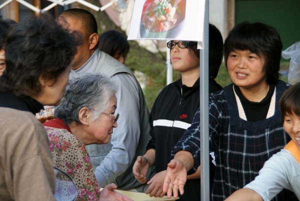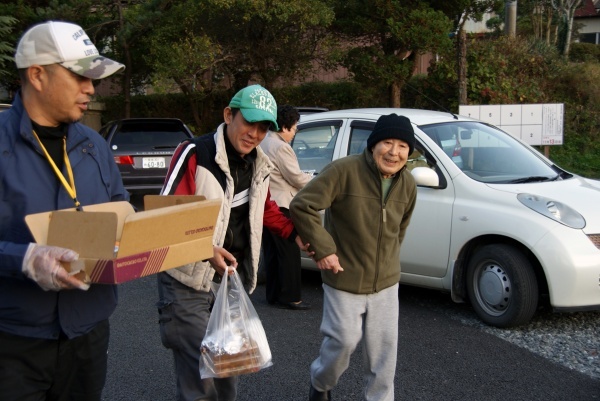 隊員相互の息もピッタリ!一手一つの合力により両日とも順調且つ盛況に炊き出しをさせて頂きました。仮設の皆様から「また来てくれたの」「今晩は何もしないですむわ!」「1食分の食費助かるわぁ!」「チョコバナナ初めて食べる!」とか、、、「この豚汁おいしい!牛汁みたい・・・エッ?」。。。顔なじみになって、色んな楽しいお話、そして仮設住宅でのご苦労されているお話も聞かせて頂きました。