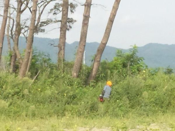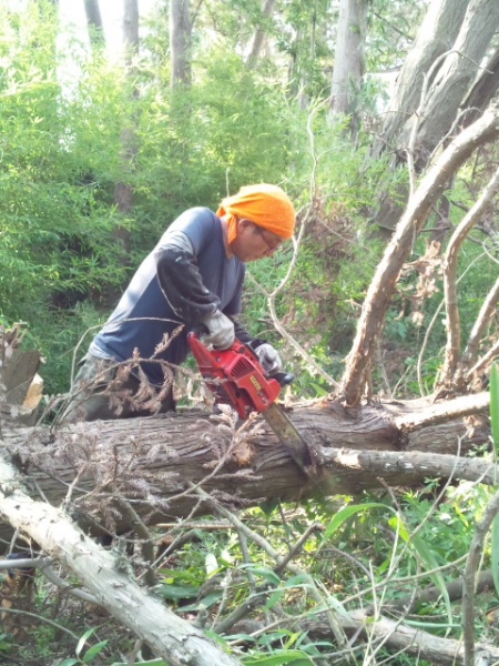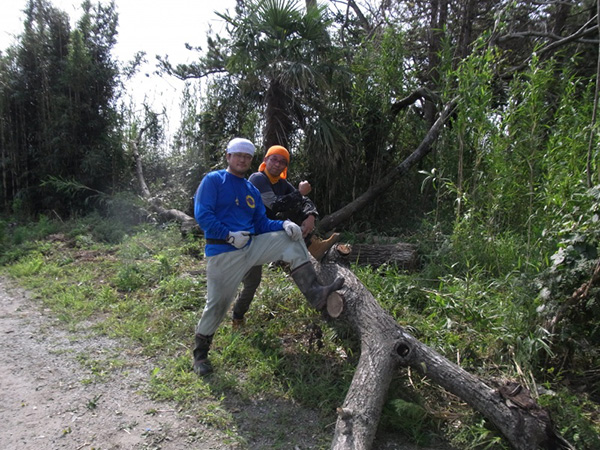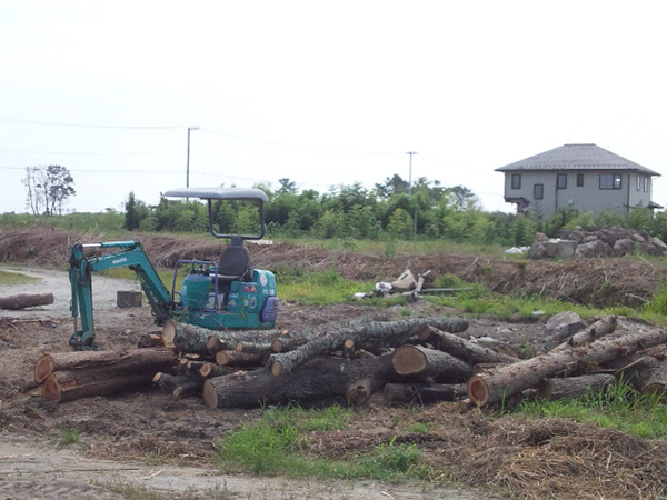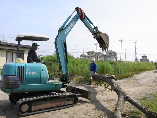 【第19次隊】その2 山元町 立ち枯れ木の伐採、片付け 東日本大震災 2012.09.05 山元町では二カ所で立ち枯れの木の伐採を自称キッコリー班が担当しました。 40センチのチェーンソーのバーが届かない程の大木も多く、倒した後も枝を払うのも苦労しました。 また、大木は建材に使うため9メートルサイズに切りユンボ君で運び出しました。 運び出した大木は、次の日よりチーム岐美さんがユニックで運搬をして下さいました。 払った枝や細い材木は薪風呂の燃料とするためにダンプにて風呂の予定地に運びました。 (12名:延べ46名)