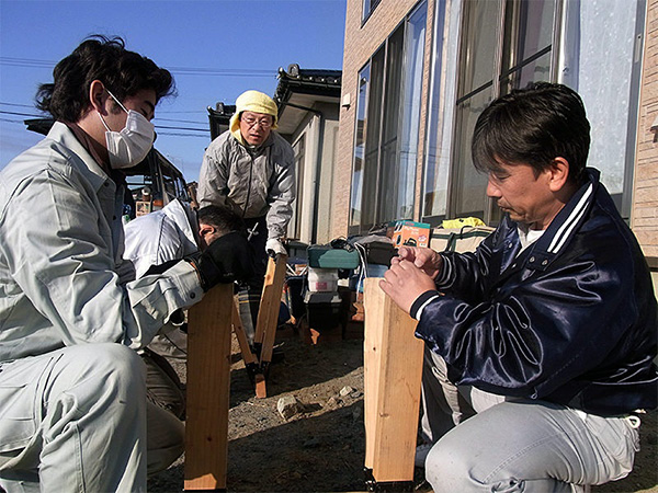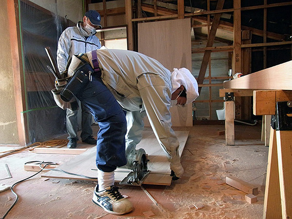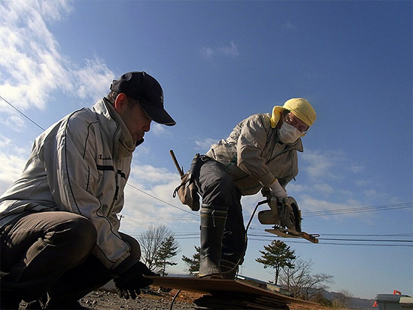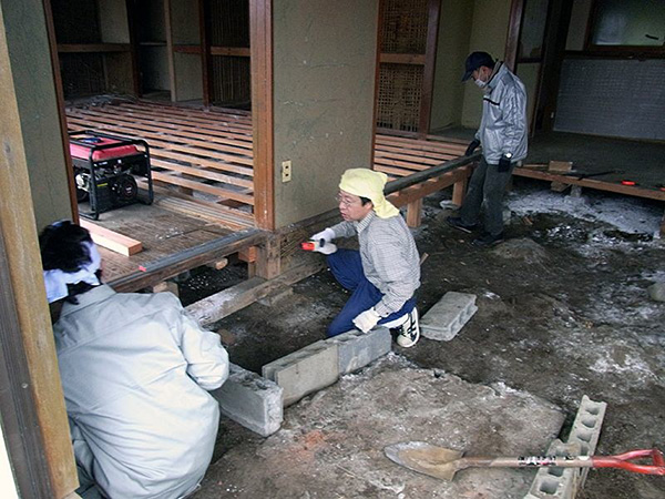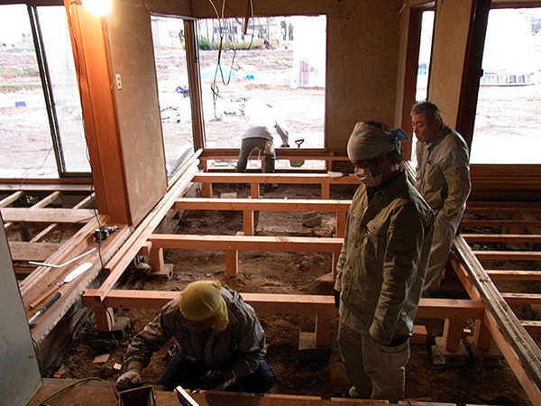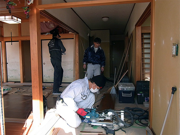 2班に分かれて、久松班は前回までの作業に続き「床のフローリング張り」の仕上げ。山本班は「外壁修理」と別の被災家屋の「床修繕」作業となりました