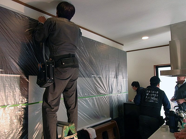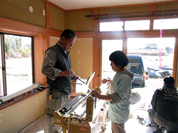 久松班に前日夕方に到着していた後発隊のメンバーも合流し、「壁紙貼り・障子張り」と「清掃及びワックスがけ」に取り掛かる。