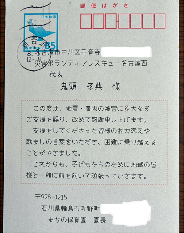 輪島市まちの保育園からお礼状を頂きました、ありがとうございます♪